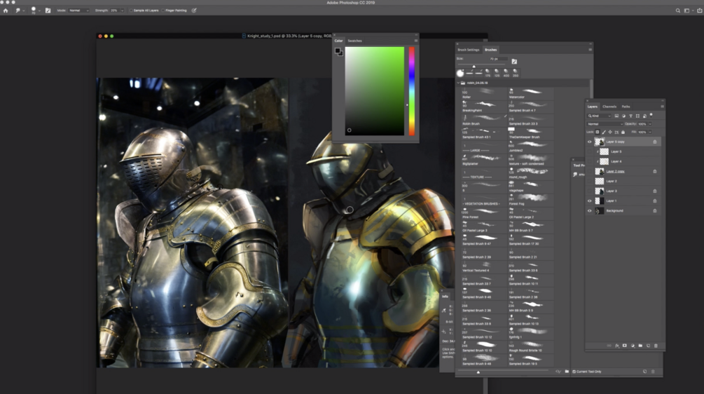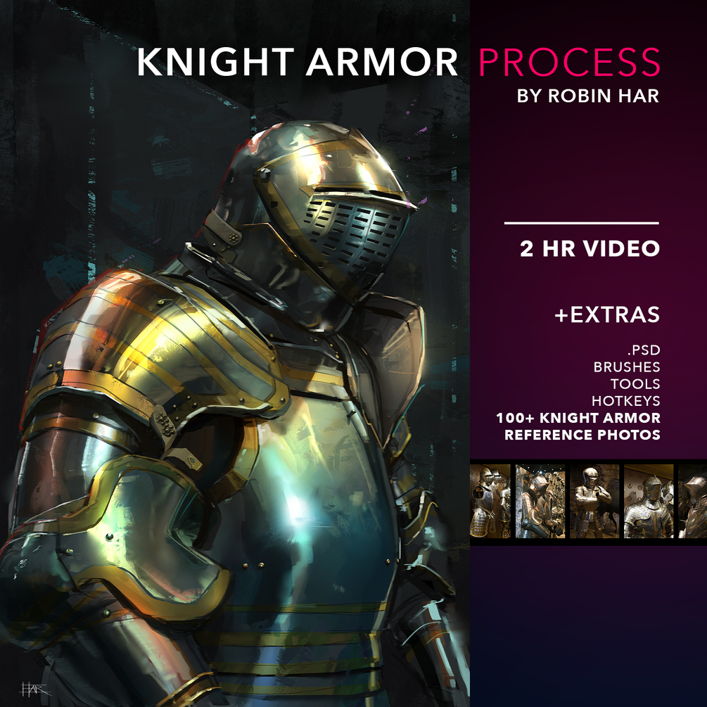 2 hour process video, PSD project file, .JPG Photo reference, .PSD setup file, Photoshop brushes, tools, and hotkeys, 102 hi-res knight armor reference photos
